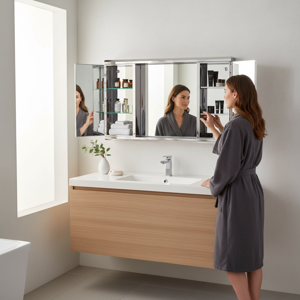Parfaite pour les salles de bain, toilettes, vestiaires, cabinets médicaux, spas, hôtels et tout espace nécessitant un rangement élégant et fonctionnel avec miroir éclairé.