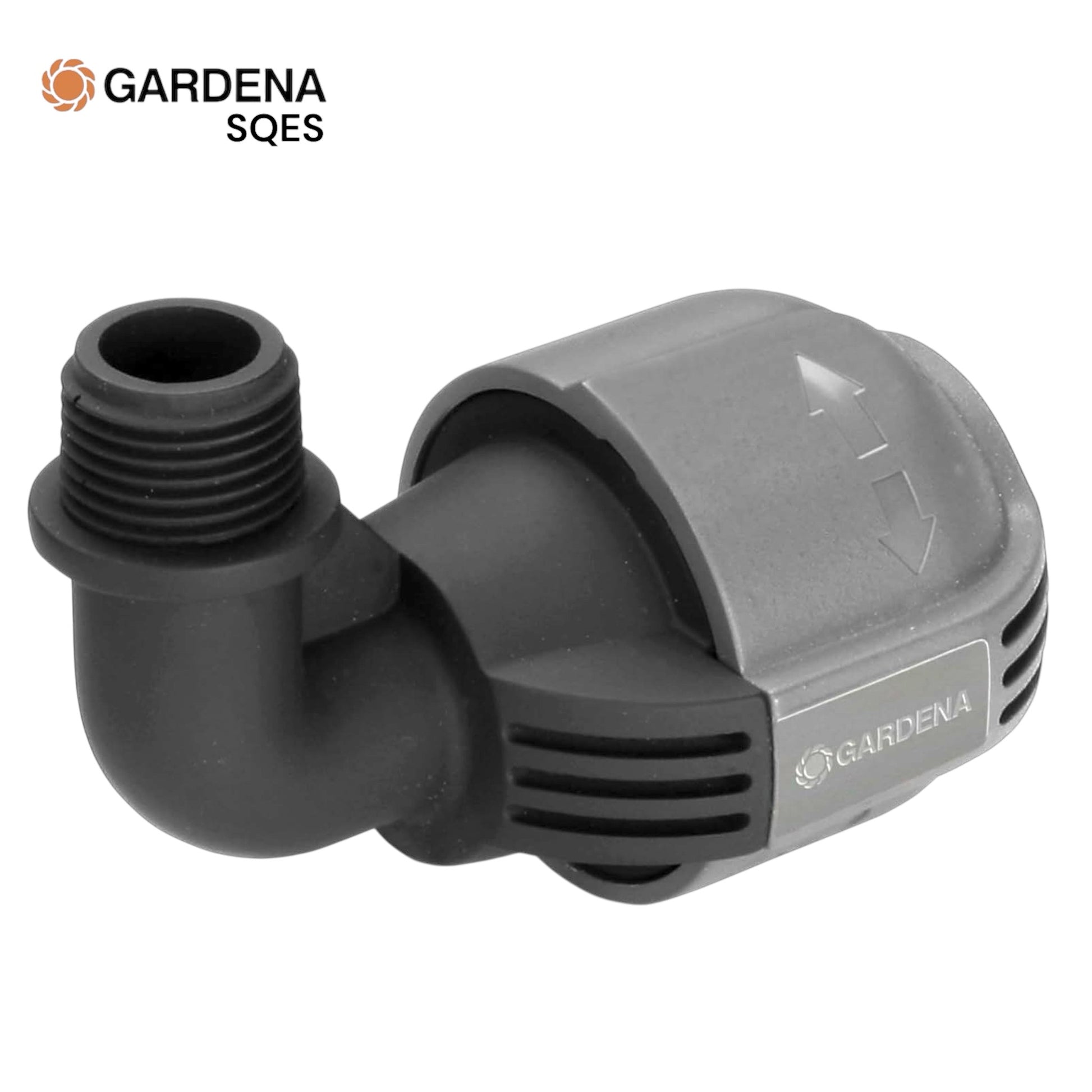 Caractéristiques : Angle 90°, diamètre 25 mm, filetage mâle 15/21 (1/2"), matériau résistant, étanchéité parfaite, compatible système GARDENA.