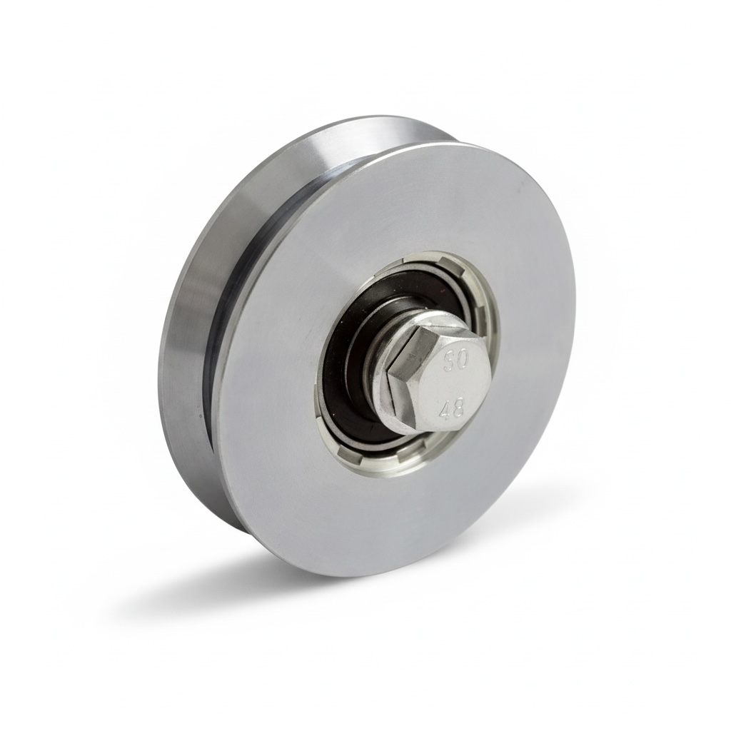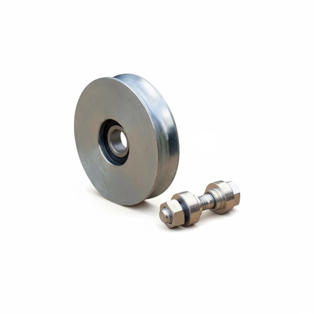 Roue de qualité professionnelle pour portes coulissantes, modèle V100 avec roulement 1 cuvette/pivot, conçue pour un usage intensif.