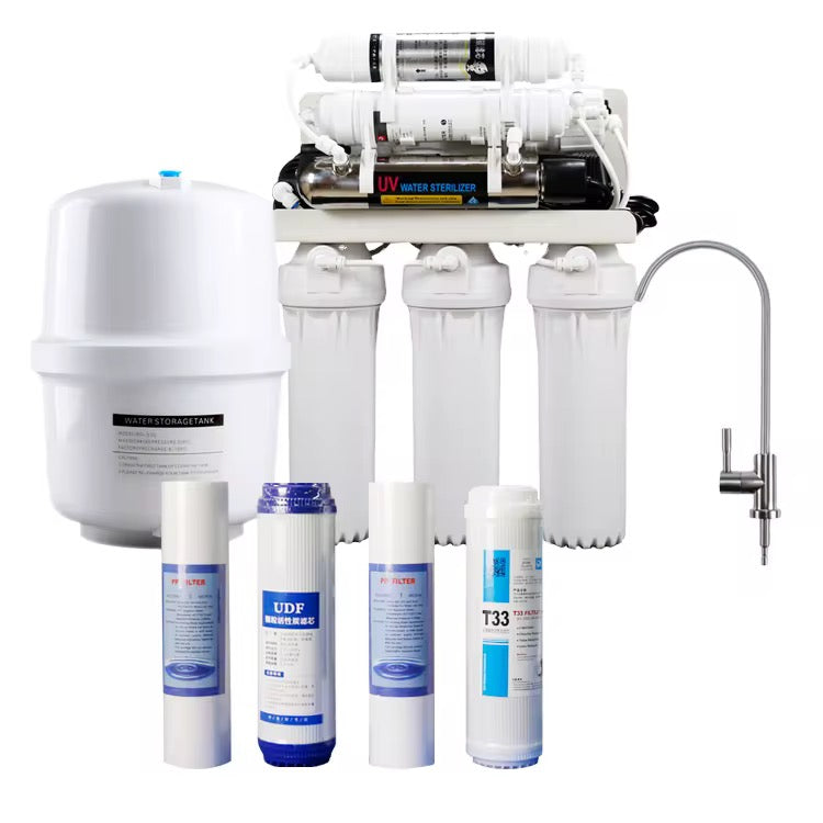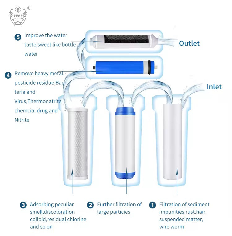 Découvrez notre osmoseur révolutionnaire à 5 étages équipé d'une pompe haute performance. Ce système de purification d'eau par osmose inverse garantit une eau ultra-pure, débarrassée de 99,9% des contaminants, métaux lourds, chlore et impuretés.