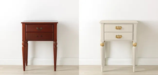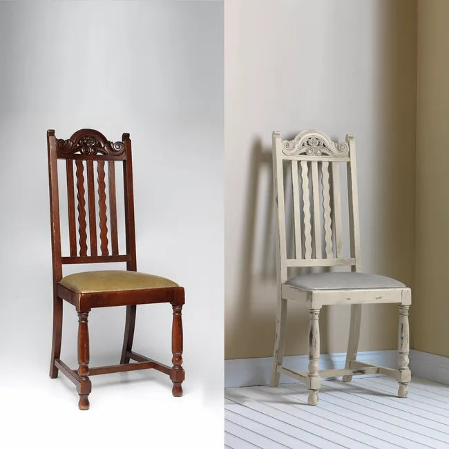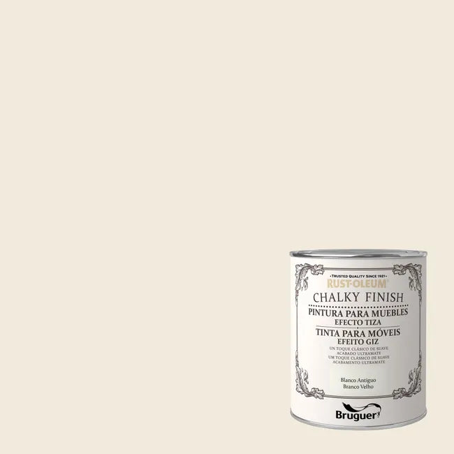 Peinture patinage pour meubles Rust-Oleum Chalky Finish de Bruguer, blanc antique avec un fini crayeux exceptionnel.