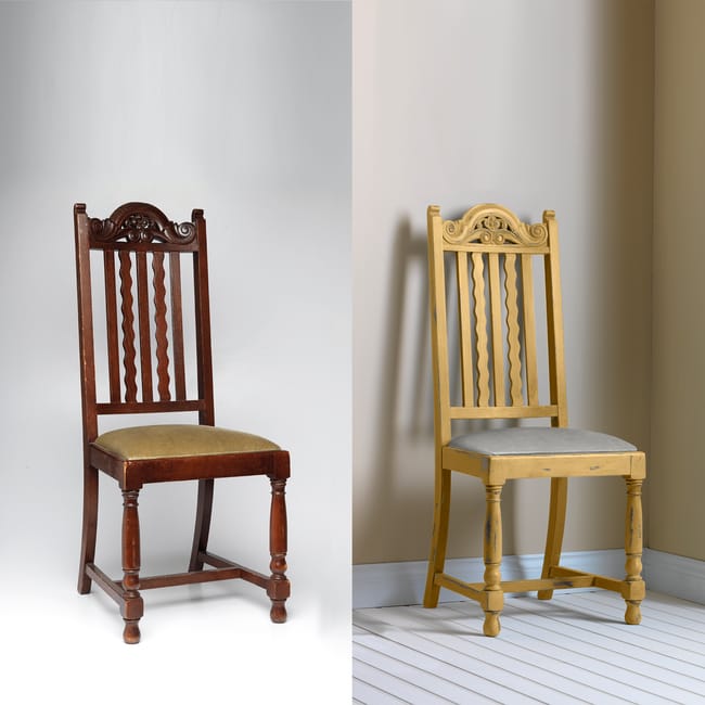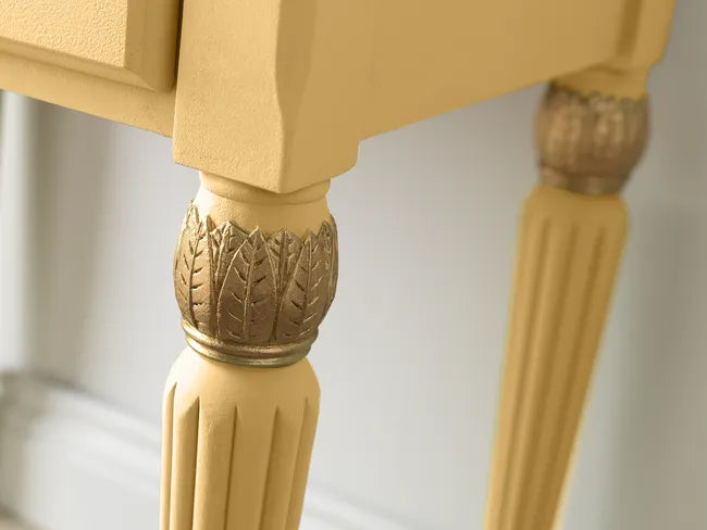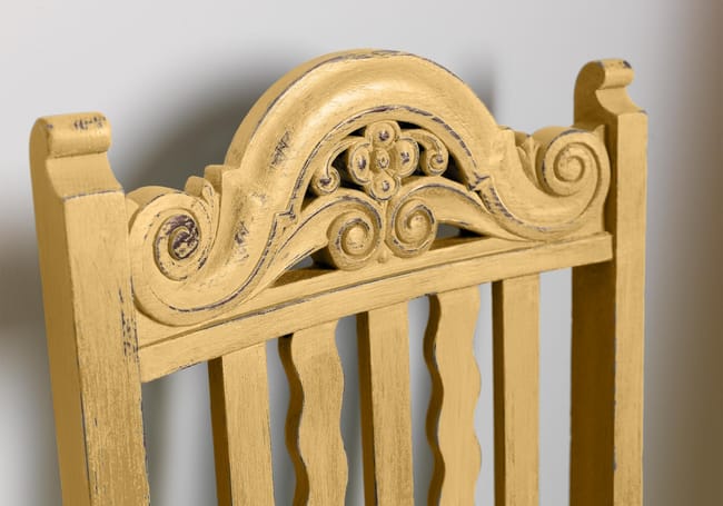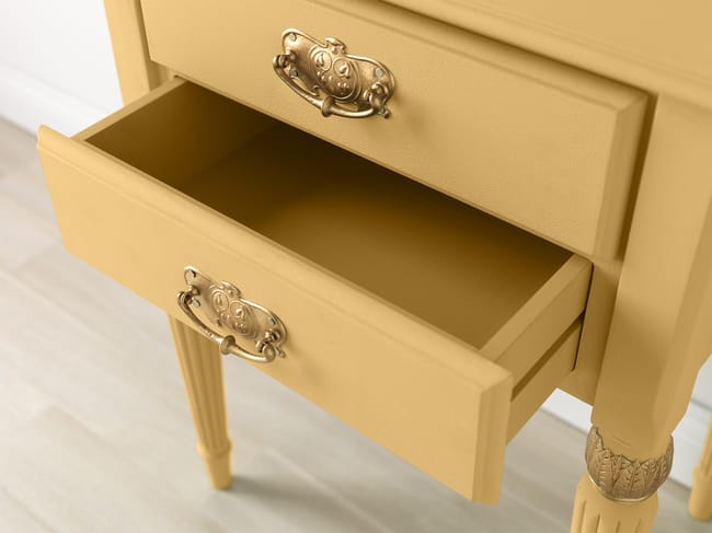 Peinture patinage pour meubles Rust-Oleum Chalky Finish de Bruguer , couleur moutarde avec un fini crayeux exceptionnel.
