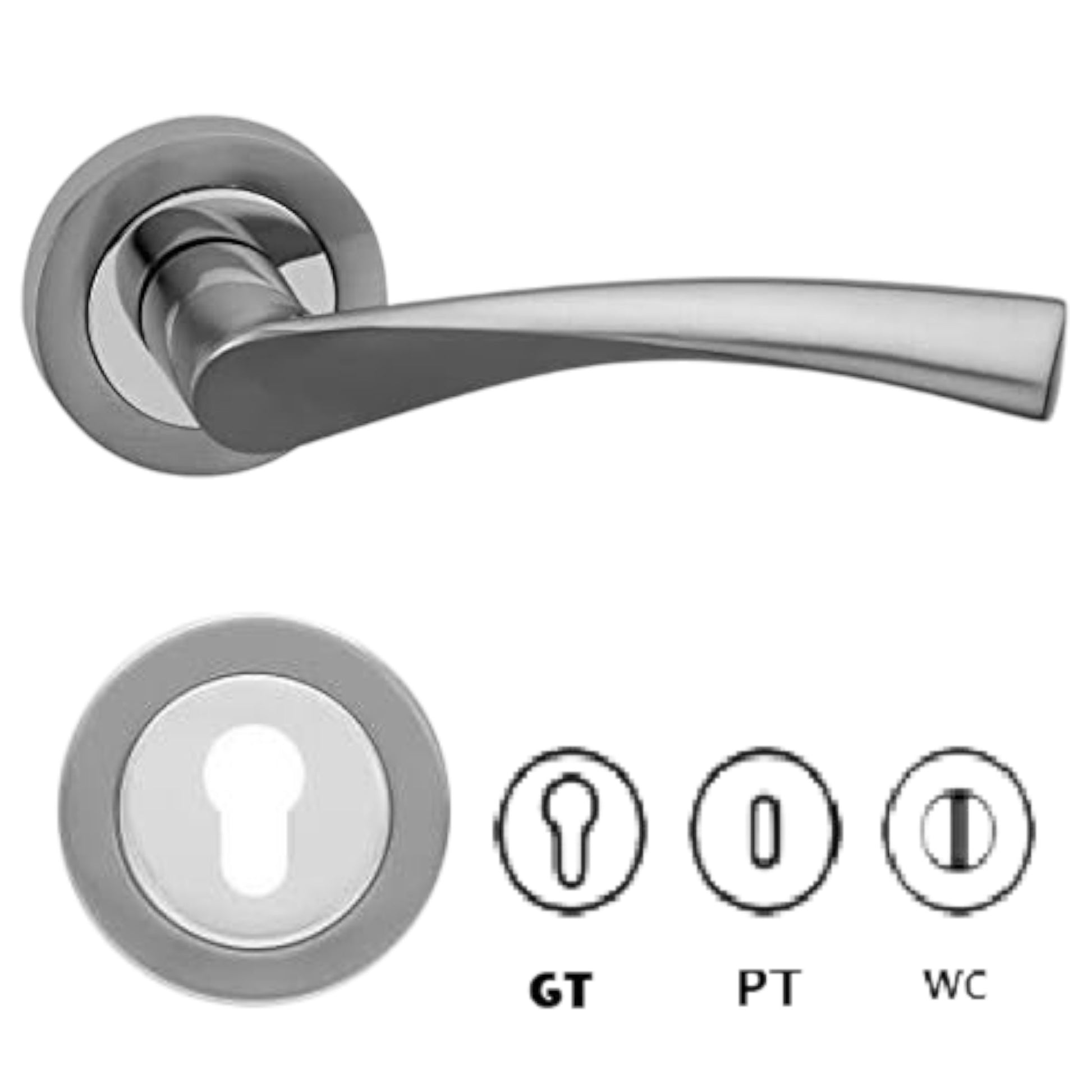 Ensemble poignée et rosace de haute qualité en finition chromée/satinée, disponible en 3 variantes selon le système de clé : Grand Trou (GT), Petit Trou (PT) et WC.