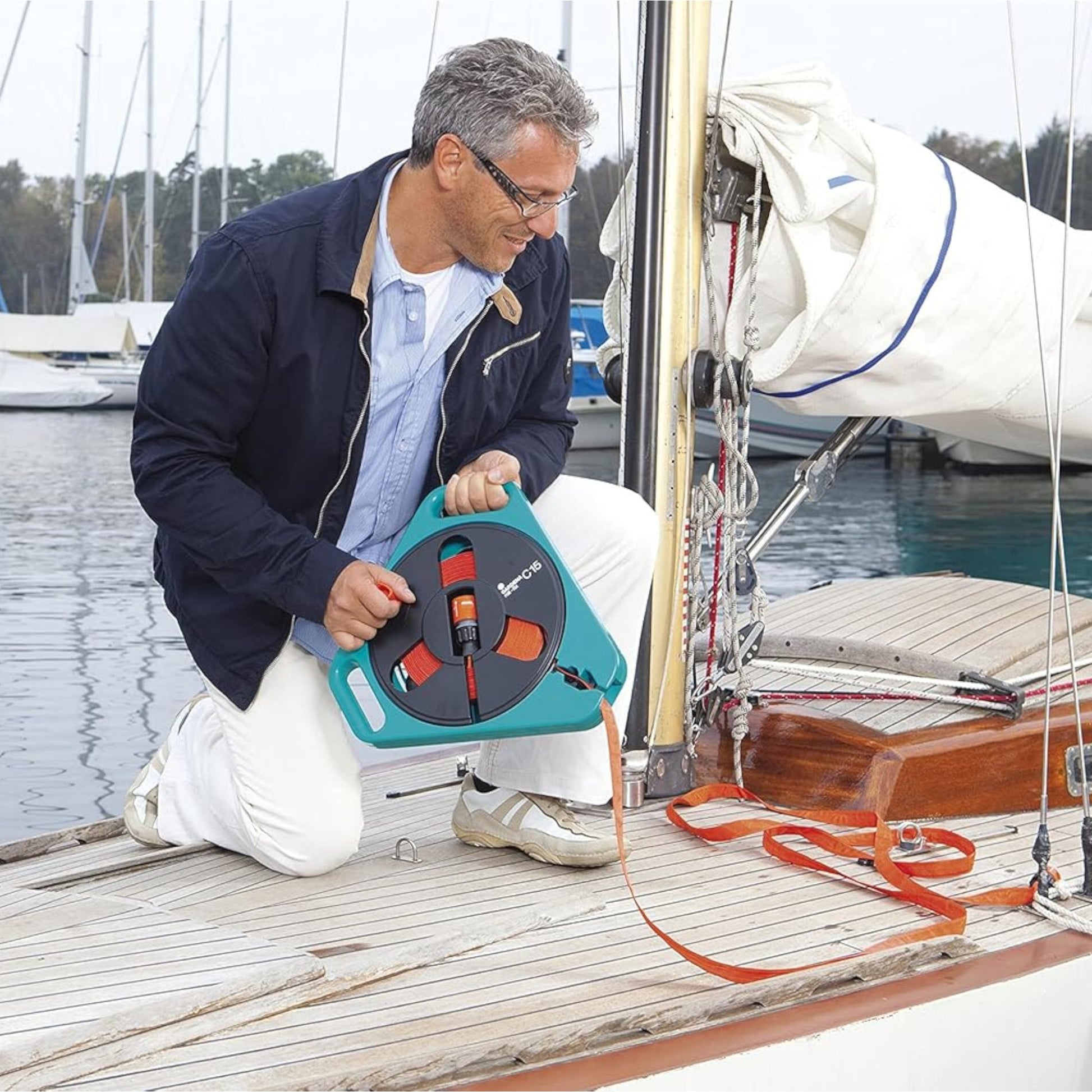 Tuyau plat textile avec boîtier enrouleur pratique. Diamètre 15 mm, design compact, rangement facile et gain de place optimal.