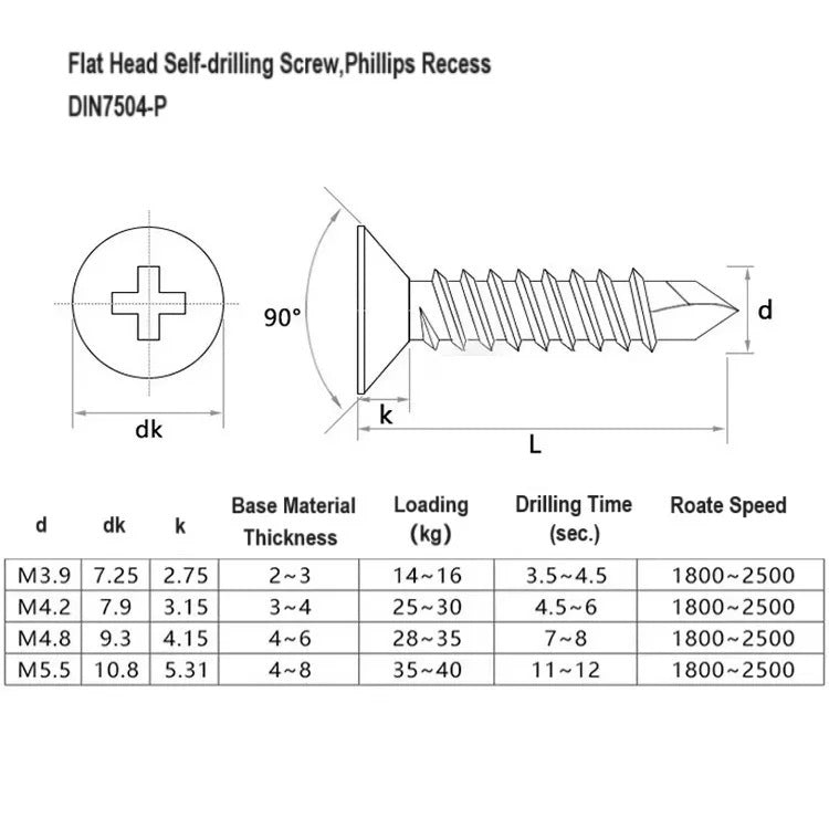 Caractéristiques techniques : ✔️ Diamètre : 5.5 mm ✔️ Longueurs : 16, 19, 22, 25, 30, 32, 38, 45, 50 mm ✔️ Tête plate cruciforme (PH) ✔️ Auto-perforante : pas besoin de perçage préalable ✔️ Acier zingué : résistant à la corrosion ✔️ Conditionnement : 500 vis par boîte
